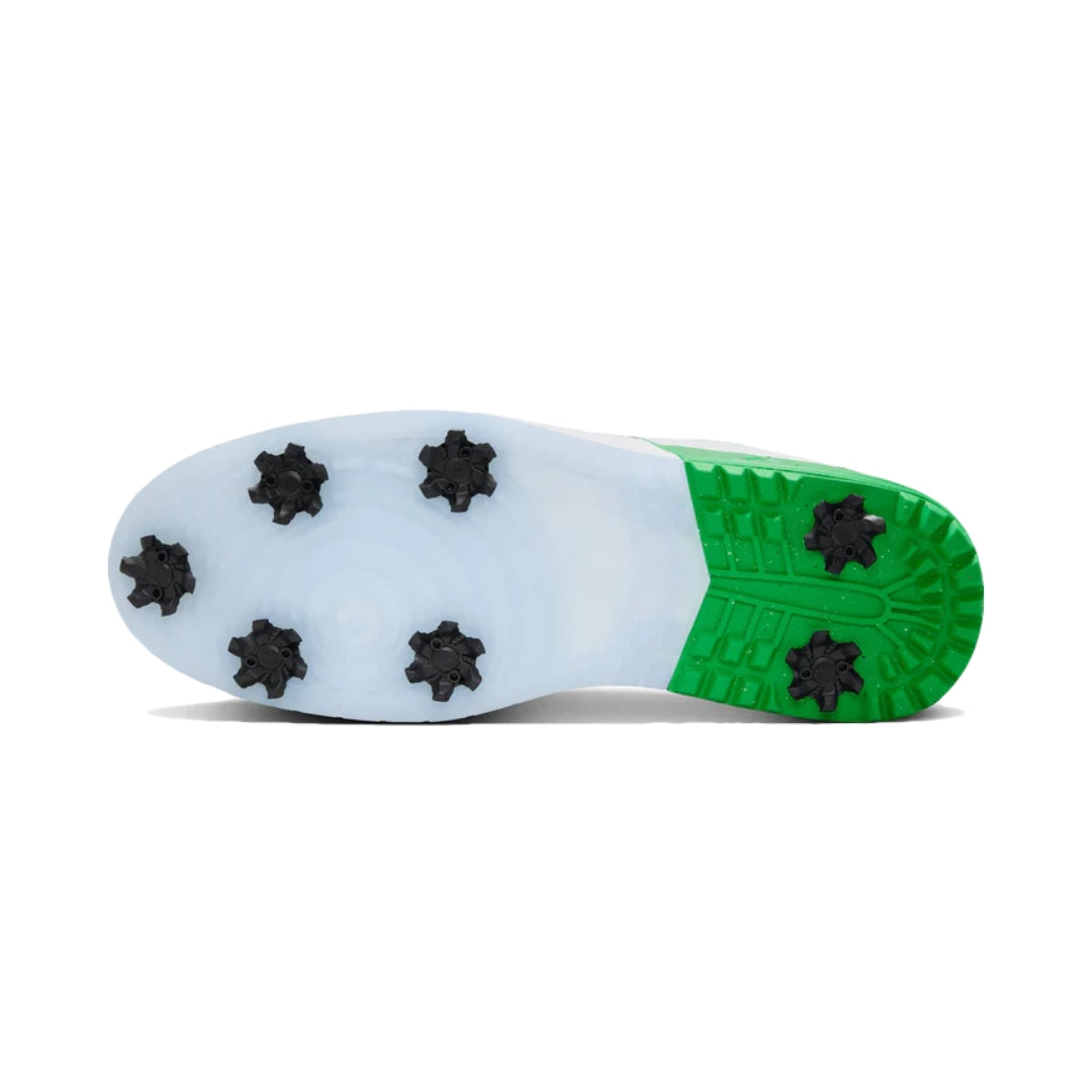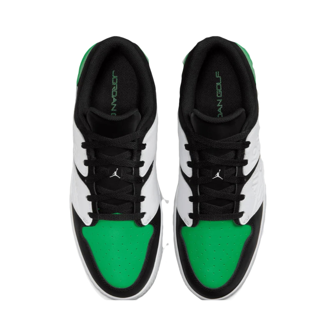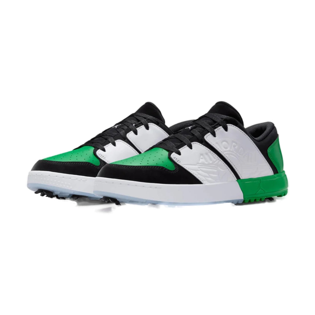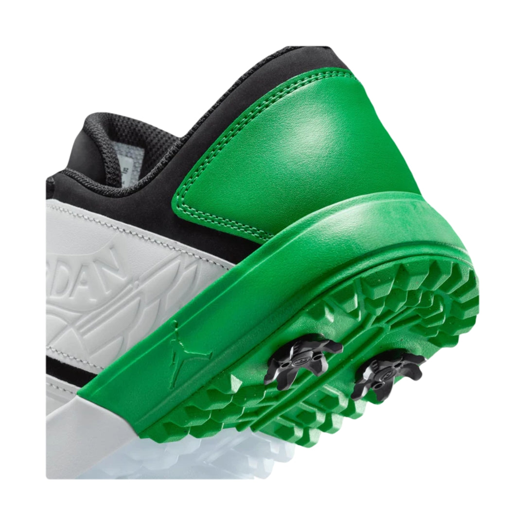 For stability, the shoe incorporates a solid plastic forefoot plate paired with a rubber heel, and includes an Air unit in the heel to provide cushioning without sacrificing support. The outsole is equipped with seven removable spikes and additional traction elements inspired by the original Air Jordan 1, ensuring the grip needed for effective swings and comfortable navigation of the course.