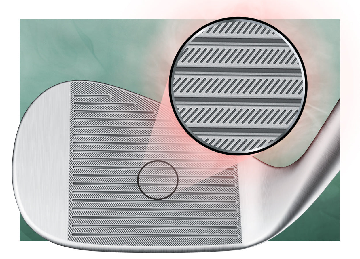 Spin Tread technology utilizes laser etching to channel away moisture and help retain spin in wet conditions. The same way that tire treads help your car stay connected to the road, Spin Tread redirects water at impact and creates more friction between the club face and golf ball to impart more spin than prior generations.
